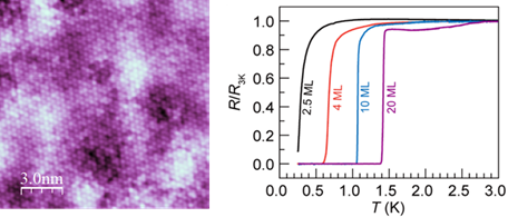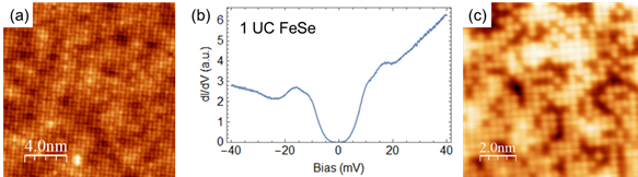 (a) Topography of monolayer FeSe on SrTiO3 by STM. (b) Tunneling spectrum showing the superconducting gap. (c) Topography of FeTe1-xSex on SrTiO3