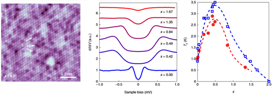 An atomic-resolved image of the NbSe2?xSx (x = 0.31) monolayer. The superconducting transition temperature as a function of x. The open squares are the gap closing temperature while the red dots are the temperatures for the disappearance of the coherence peaks.