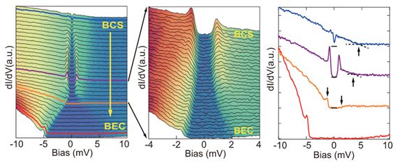 The dI/dV spectra cross the BCS-BEC region. Spectra acquired at the locations marked by colored lines. The arrows indicate the top of hole band.